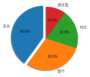 # autopct : 상대도수를 퍼센트로 표현 labels = ['초코','딸기','치즈','생크림'] |