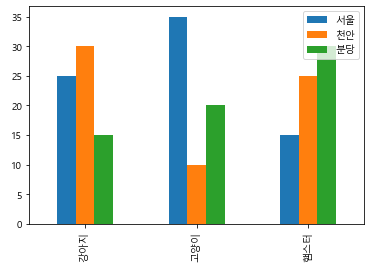 # 스택형 막대 그래프 data = DataFrame({'서울':[25,35,15], '천안':[30,15,25], |