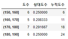 # 도수분포표 데이터프레임 형식으로 만들기 bins = list(range(150,191,10)) height_cut = pd.cut(height,bins,right=True) |