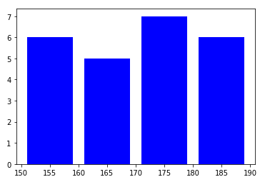 plt.hist(height, bins = bins,rwidth = 0.8,color='blue') |