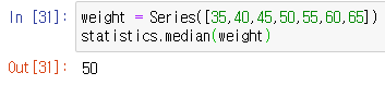 관측값이 홀수일때 중앙값 # 차례로 정렬 했을때 중간번째 있는 값 weight = Series([35,40,45,50,55,60,65])