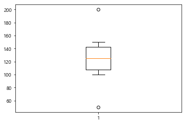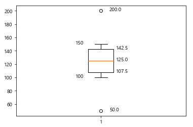 # 박스 옆에 값 적어주기 (x축, y축, 적을 값) plt.boxplot(data) |
