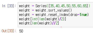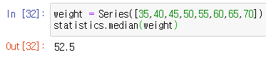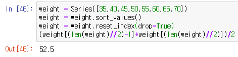 관측값이 짝수일때 중앙값 # 차례로 정렬 했을때 중간번째 있는 두값을 더하고 weight = Series([35,40,45,50,55,60,65,70])