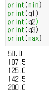 - 최소값(0), 제1사분위수(25), 중위수(50), 제3사분위수(75), 최대값(100)
