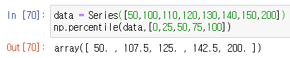 - 사분위값 : np.percentile(객체,[0,25,50,75,100])