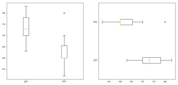 # 여러그림을 한 화면에 넣을때 fig = plt.figure(figsize=(15,7)) # 한 화면의 크기 만들기 ax1 = fig.add_subplot(1,2,1) # 1행 2열 그림중 1번째 ax2 = fig.add_subplot(1,2,2) # 1행 2열 그림중 2번째 ax1.boxplot([height['남자'],height['여자']], ax2.boxplot([height['남자'],height['여자']], labels=['남자','여자'],vert=False) |