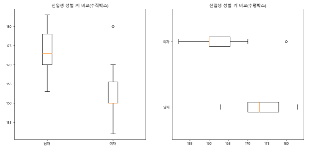 # 그림별 제목 넣기 fig = plt.figure(figsize=(15,7)) ax1 = fig.add_subplot(1,2,1) #1행 2열 그림중 1번째 ax2 = fig.add_subplot(1,2,2) #1행 2열 그림중 2번째 ax1.boxplot([height['남자'],height['여자']],labels=['남자','여자']) ax2.boxplot([height['남자'],height['여자']],labels=['남자','여자'],vert=False) ax1.set_title("신입생 성별 키 비교(수직박스)") ax2.set_title("신입생 성별 키 비교(수평박스)") plt.show() |