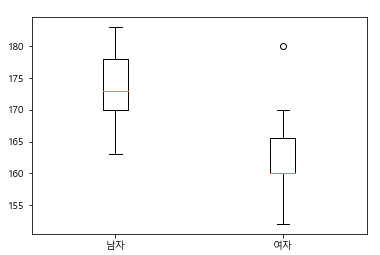 # 여러개의 박스를 동시에 보고 싶을때 (수평방향) plt.boxplot([height['남자'],height['여자']], |