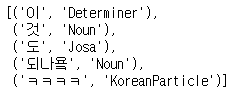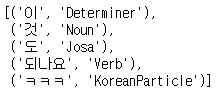 # stem=True : 원형 글자로 바꿔준다. (기본값 False) okt.pos("이것도 되나욬ㅋㅋㅋㅋ",norm = True,stem=True) | ![]() |