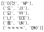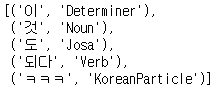 # norm = True : 품사 태깅(기본값 False) okt.pos("이것도 되나욬ㅋㅋㅋㅋ",norm = True) | ![]() |