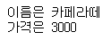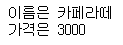 | m1.name = '카페라떼' m1.price = 3000 m1.MenuPrint() |