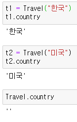 # 초기 생성자 안에 있으면 인스턴스변수도 되고 클래스 변수도 된다. class Travel : |