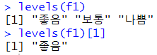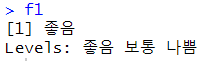 # level에 있는 값만 들어가야한다. f1 <- factor("좋음",c("좋음","보통","나쁨")) |