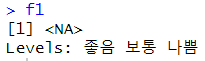 # 없는 값이 들어갔을때 f1 <- factor("별로",c("좋음","보통","나쁨")) |