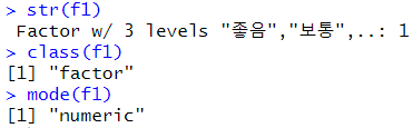 # factor 구조 및 타입 확인 str(f) class(f) mode(f) |