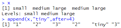 # 펙터에 값을 추가하려면 벡터형으로 바꾼뒤 추가해야한다. x <- factor(c("small","medium","large","medium","large")) x <- as.vector(x) # 형바꾸기 x <- append(x,"tiny",after=4) x <- as.factor(x) |