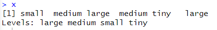 # !!주의!! 펙터형은 문자가 아니라서 append를 사용하면 데이터가 망가짐 x <- factor(c("small","medium","large","medium","large"), |