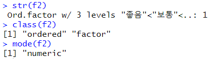 # 순서형 factor 구조 및 타입 확인 str(f2) class(f2) mode(f2) |
