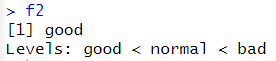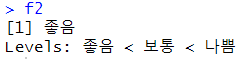 # 순서형 factor 생성 f2 <- factor("좋음",c("좋음","보통","나쁨"),ordered=TRUE) |