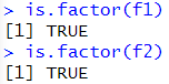 # factor 타입인지 확인 is.factor(f1) is.factor(f2) |