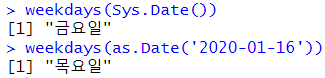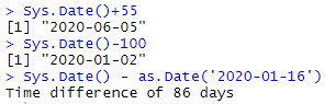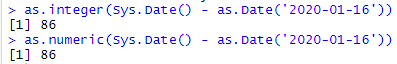 # 숫자만 보기 as.integer(Sys.Date() - as.Date('2020-01-16')) as.numeric(Sys.Date() - as.Date('2020-01-16')) |
