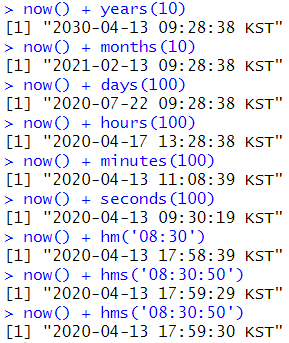 # 날짜, 시간 더하기 now() + years(10) now() + months(10) now() + days(100) now() + hours(100) now() + minutes(100) now() + seconds(100) now() + hm('08:30') now() + hms('08:30:50') now() + hms('08:30:50') |