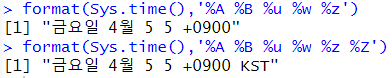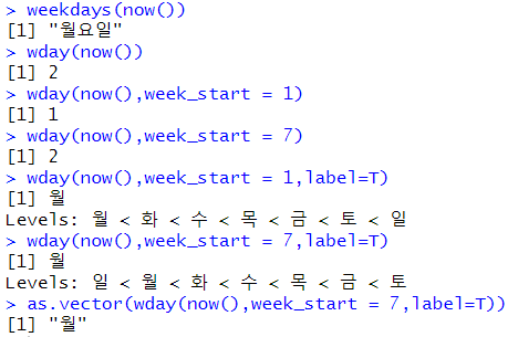 # 요일추출 weekdays(now()) # format(Sys.time(),'%A') wday(now()) wday(now(),week_start = 1) # 월요일 기준 wday(now(),week_start = 7) # 일요일 기준 wday(now(),week_start = 1,label=T) # 월요일 기준 wday(now(),week_start = 7,label=T) # 일요일 기준 as.vector(wday(now(),week_start = 7,label=T)) |
