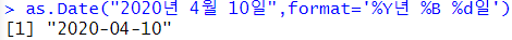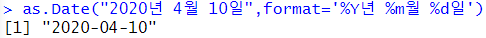 as.Date("2020년 4월 10일",format='%Y년 %m월 %d일') |