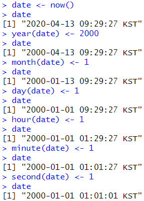 #시간 바꾸기 date <- now() year(date) <- 2000 month(date) <- 1 day(date) <- 1 hour(date) <- 1 minute(date) <- 1 second(date) <- 1 date |