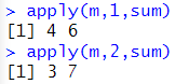 # 기본 사용 m <- matrix(1:4, ncol=2) apply(m,1,sum) apply(m,2,sum) |
