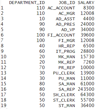 # 세로 방향 aggregate(SALARY ~ DEPARTMENT_ID+JOB_ID, emp, sum) |