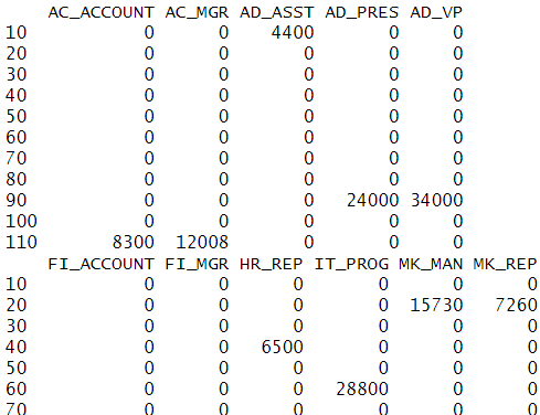 tapply(emp$SALARY,data.frame(emp$DEPARTMENT_ID,emp$JOB_ID),sum,default=0) |