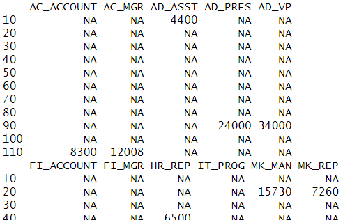 # NA값을 0으로 바꿔서 출력 tapply(emp$SALARY,list(emp$DEPARTMENT_ID,emp$JOB_ID),sum,default=0)