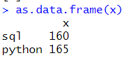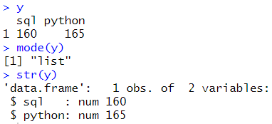 # 매트릭스 -> 데이터프레임 y <- data.frame(matrix(x,ncol=2)) names(y) <- c("sql","python") mode(y) str(y) |