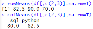 # 행, 열의 평균 rowMeans(df[,c(2,3)],na.rm=T) colMeans(df[,c(2,3)],na.rm=T) |