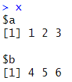 x <- list(a=1:3,b=4:6) ![]() |