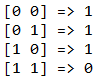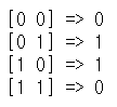 | # 파이썬으로 구현하기 input = np.array([[0,0],[0,1],[1,0],[1,1]]) for i in input : print(str(i)+" => "+str(XOR(i[0],i[1]))) |