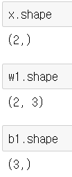 # 입력층, 0층 x = np.array([0.1,0.5]) w1 = np.array([[0.1,0.3,0.5],[0.2,0.4,0.6]]) b1 = np.array([0.1,0.2,0.3]) x.shape w1.shape b1.shape |