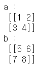 # 2차원 배열 만들기 a = np.array([[1,2],[3,4]]) b = np.array([[5,6],[7,8]]) |