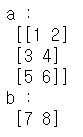 # 2차원 배열 만들기 a = np.array([[1,2],[3,4],[5,6]]) b = np.array([7,8]) |