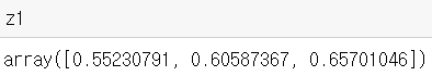# 첫번째 은닉층, 1층 a1 = np.dot(x,w1) + b1 # 활성화 함수 사용 (시그모이드) def sigmoid(x) : return 1/(1+np.exp(-x)) z1 = sigmoid(a1) z1 |