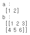 # 2차원 배열 만들기 a = np.array([1,2]) b = np.array([[1,2,3],[4,5,6]]) |