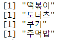 # 변수에 담은 내용 반복 x <- c('떡볶이','도너츠','쿠키','주먹밥') for(i in x){ print(i) } |