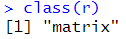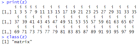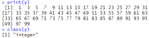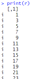 # 반복문으로 값 쌓기 x<-NULL; y<-NULL; z<-NULL; r<-NULL for(i in 1:100){ if(i%%2 != 0){ x <- append(x,i) y <- c(y,i) z <- cbind(z,i) r <- rbind(r,i) } } print(x) class(x) print(y) class(y) print(z) class(z) print(r) class(r) |