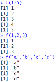 # 벡터로 넣기 f <- function(...){ x <- c(...) for(i in x){ print(i) } } f(1:5) f(1,2,3) f('a','b','c','d') |