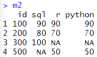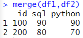 df1 <- data.frame(id=c(100,200,300),sql=c(90,80,100)) # 기본 사용법 merge(df1,df2) |