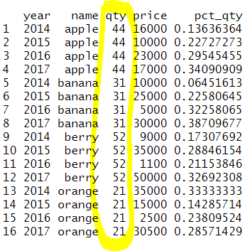 # 행 별 비율 구하기 (잘못된 예) ddply(sales,'name',transform,qty=sum(qty),pct_qty=(qty/sum(qty))) |