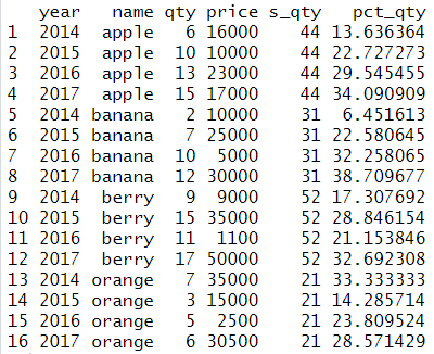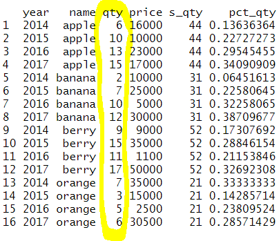 # 행 별 비율 구하기 (올바른 예) ddply(sales,'name',transform,s_qty=sum(qty),pct_qty=(qty/sum(qty))) |