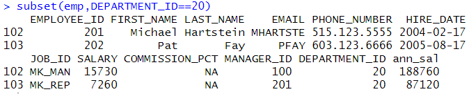# 기본 사용법 subset(emp,DEPARTMENT_ID==20) |