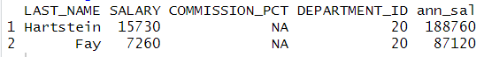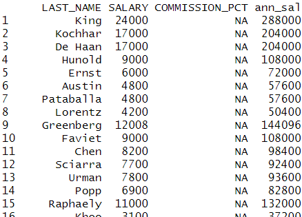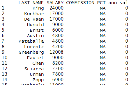 | emp %>% select(LAST_NAME,SALARY,COMMISSION_PCT) %>% mutate(ann_sal = SALARY*12+ifelse(is.na(COMMISSION_PCT),0, SALARY*COMMISSION_PCT)) |